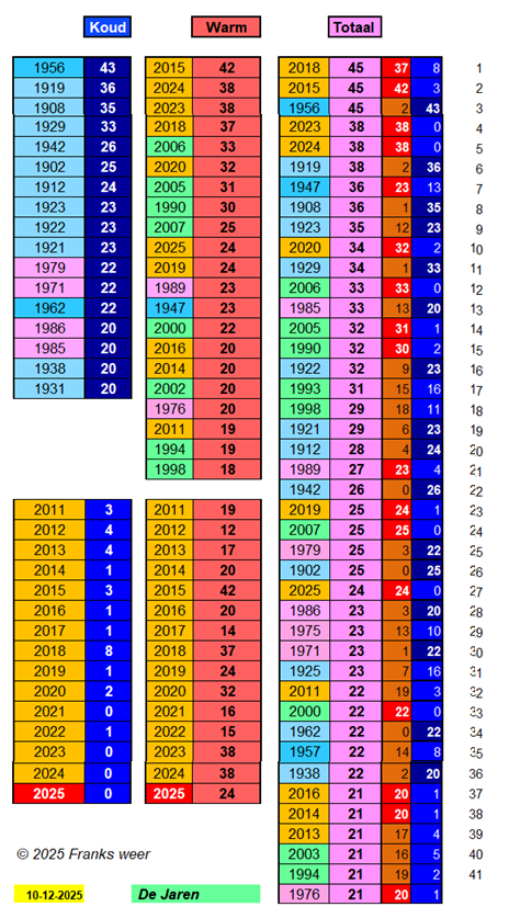 2025 had 24 warmte records (10 maximum en 6 minimum), 2025 is opgenomen en verwerkt in de tabel. Na 2023 en 2024 had ook 2025 geen koude dagrecords.
