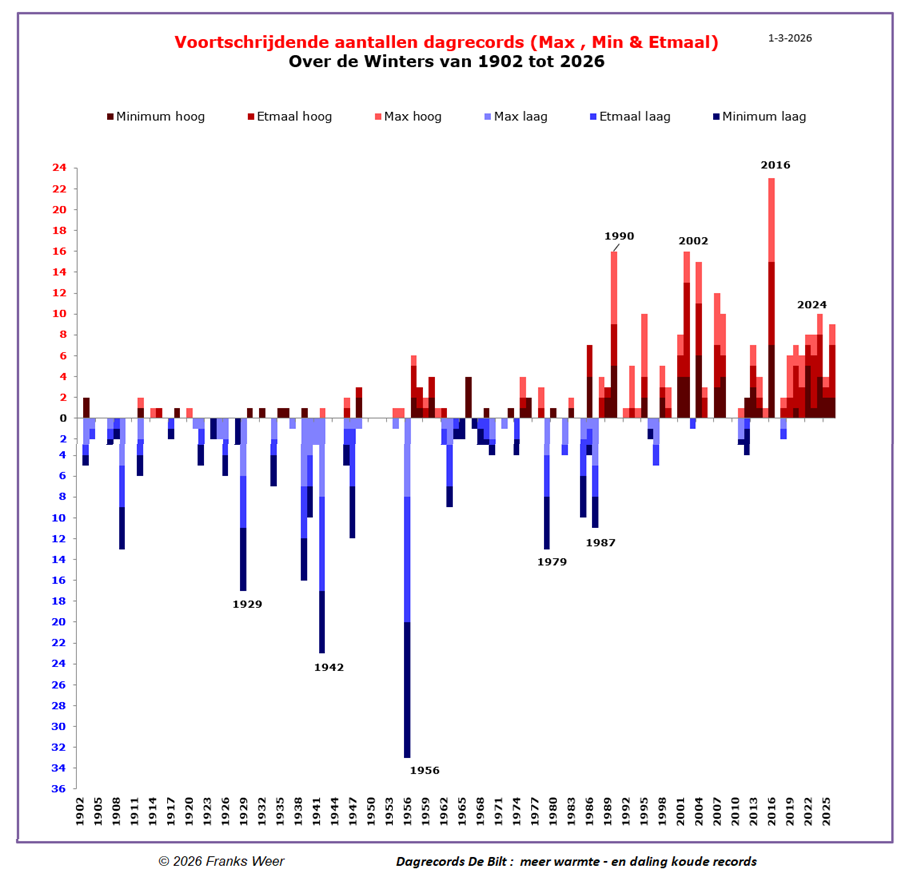 – 2026 heeft 8 dagrecords, namelijk 3 etmaal records, 4 maximum (4 op rij in maart) en een minimum dagrecord. Op 25 februari was de etmaal temperatuur 12,5° (in 2021 werd het 11,4°). Op 26 februari 12,0° (in 1978 was het 10,6°). Op de 27e was ze 11,4° (in 1978 was het 9,9°). Ook de minimum temperatuur was record hoog op de 27e met 8,9° (in 1912 was ze 8,1°). Op 2 maart werd het 16,2° (in het zonnige jaar 1959 was het 16,0°). Op 3 maart werd het 16,7° (het jaar 2024 moest een dag inleveren) en op 4 maart werd het 16,1° (in 1939 15,0°). Op 5 maart werd het 16,8°.
