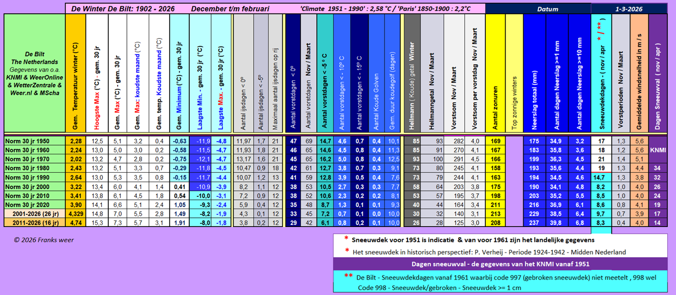Hieronder tabellen met de 30 jarige normen en ook met de stand van de laatste 25- en 15 jaar, na de winter van 2025.