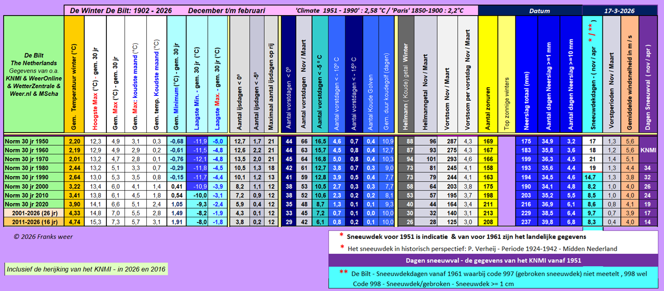 Hieronder tabellen met de 30 jarige normen en ook met de stand van de laatste 25- en 15 jaar, na de winter van 2025.