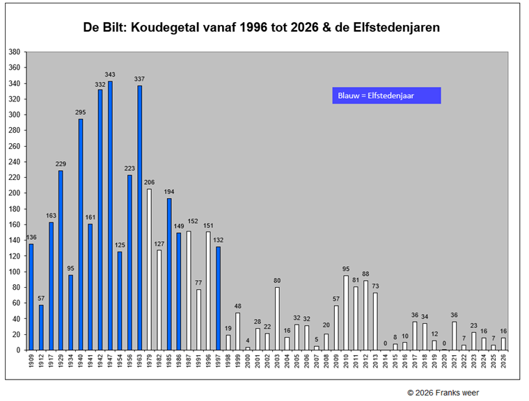 De gegevens in 2016, omdat het een indicatie is wat het koudegetal precies was tijdens de Elfstedentocht, wordt deze tabel (betreffende de kleine verschillen in de jaren 1901 tot 1951) niet aangepast na de nieuwe herijking in 2026.