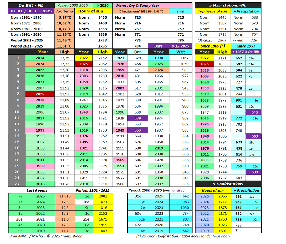 2025 stond na 31 oktober 2025 al op plaats 4 met meer dan 2003 uur. Voor meer informatie over het aantal zonuren: de link – Zonuren