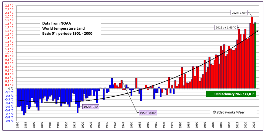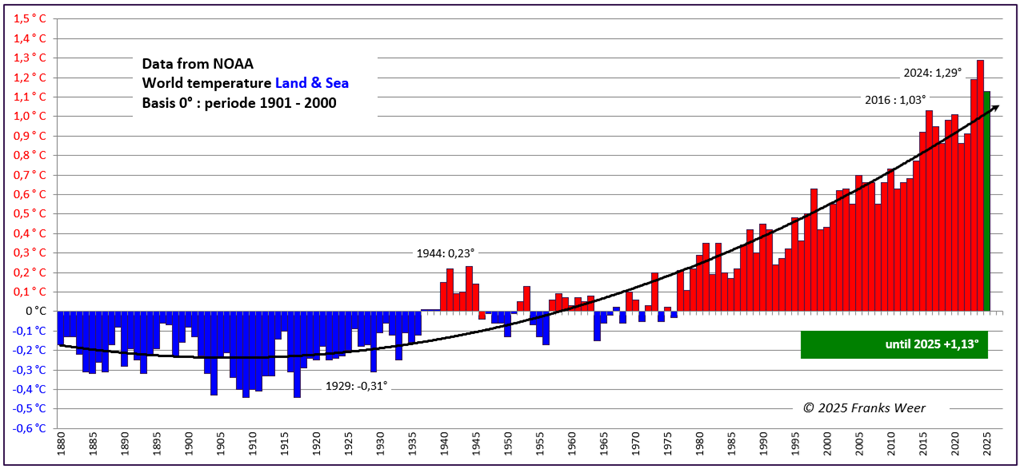 – NOAA, 2 staafdiagrammen t/m 2025. Land en van Land & Zee -> 2024 was wereldwijd record warm