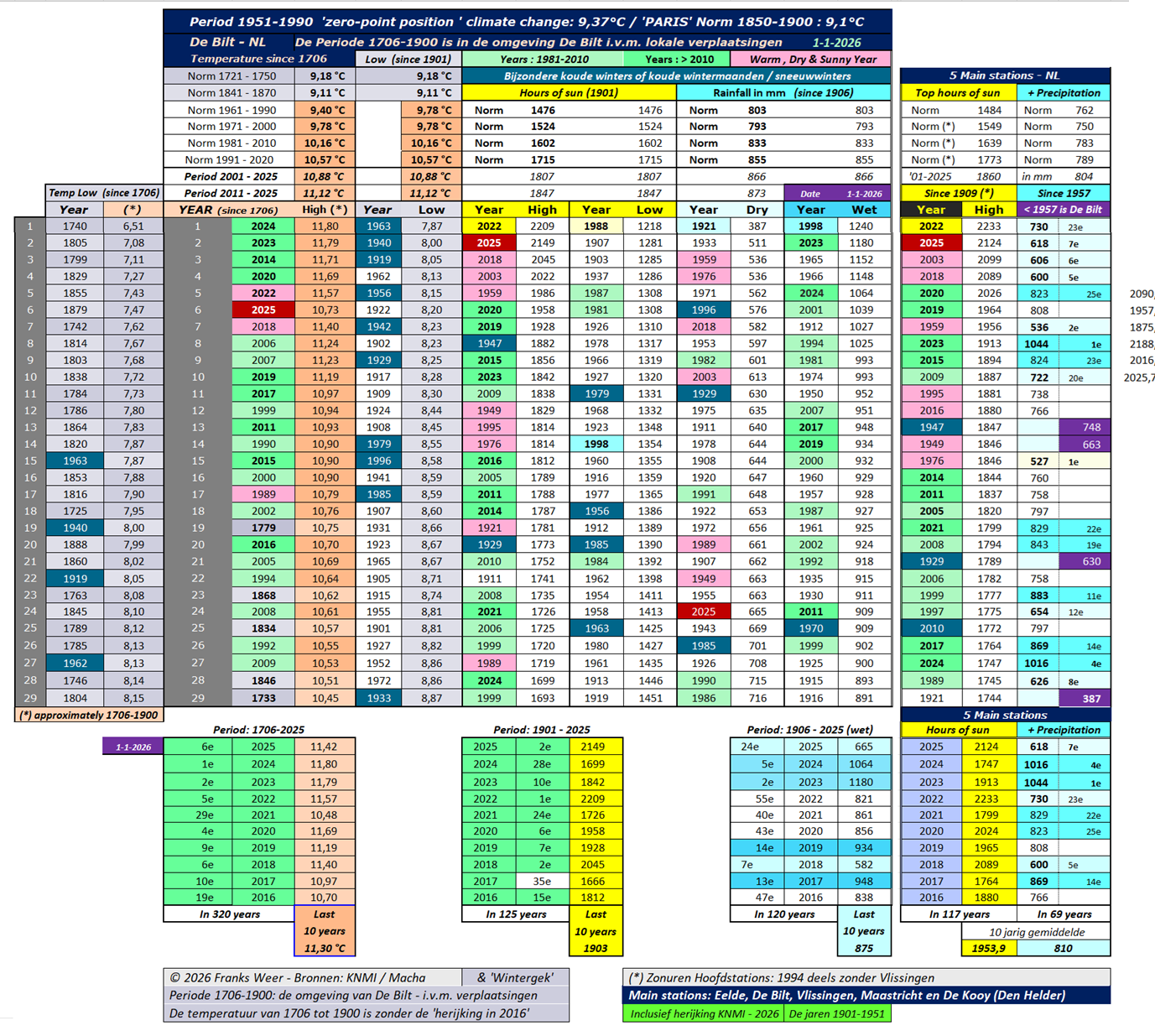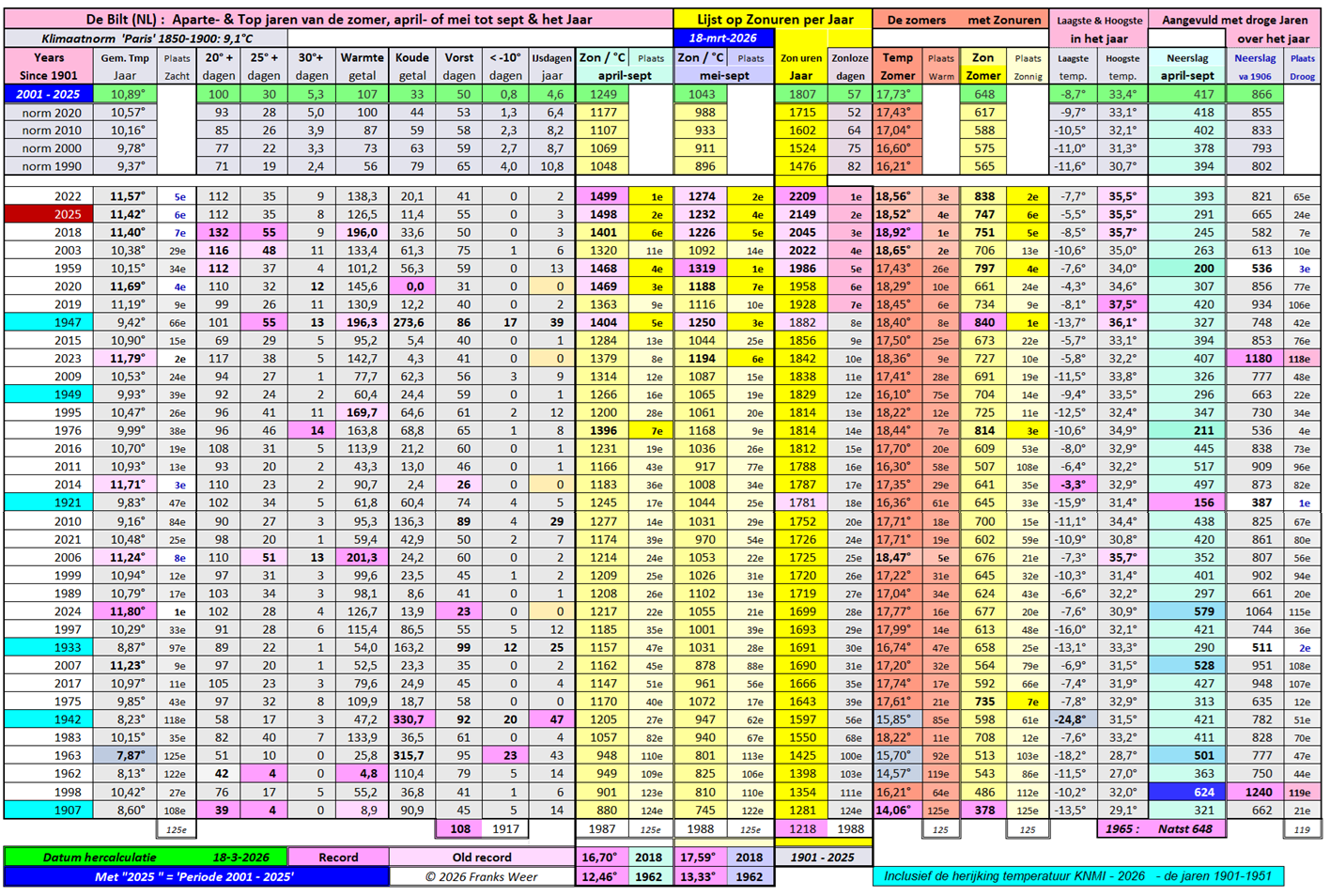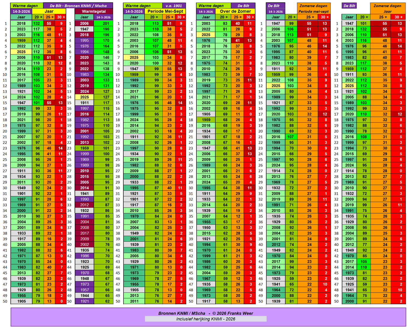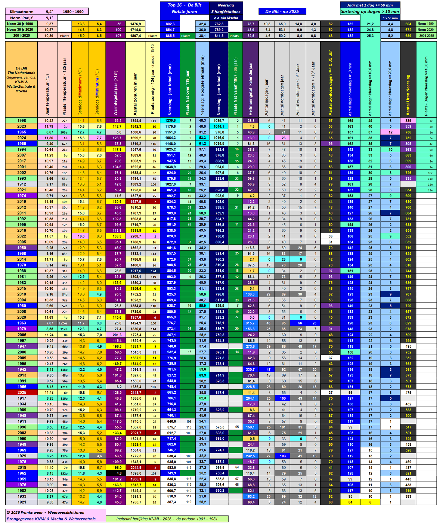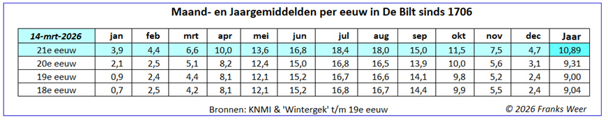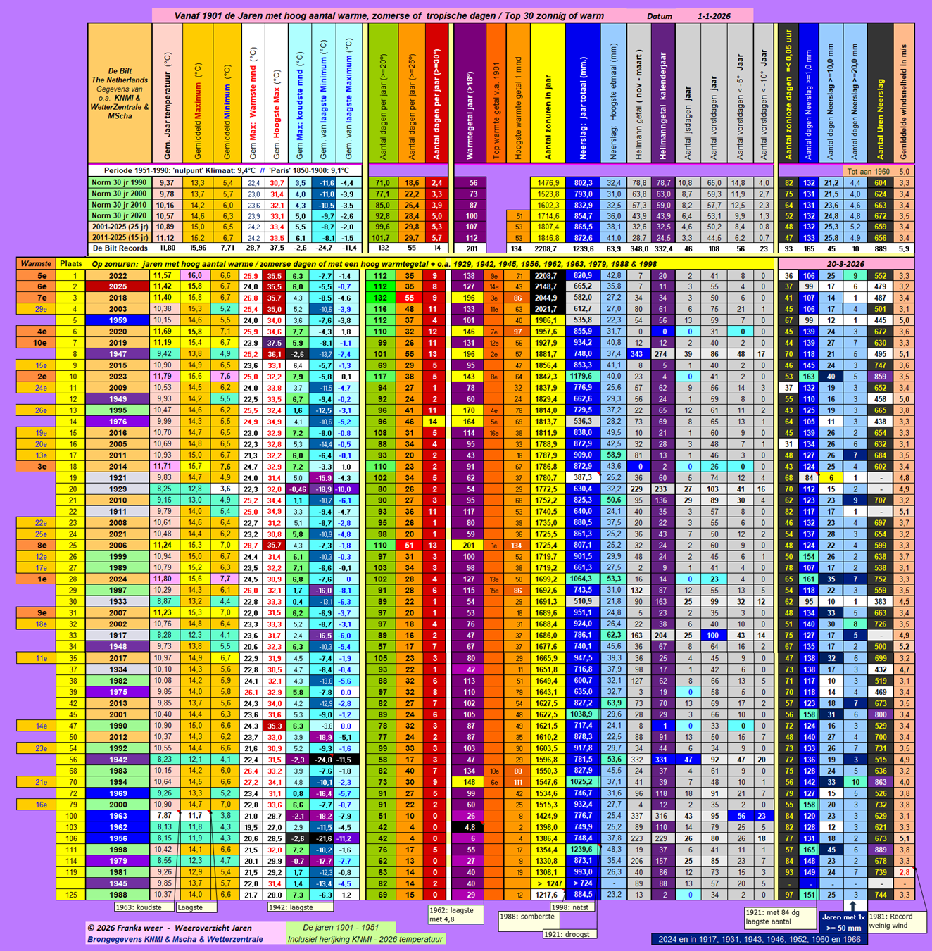 Opmerking: door de herijking van het KNMI in 2026 over de jaren 1901 tot 1951, is de tabel aangepast op 14-3-2026