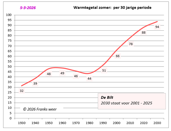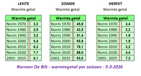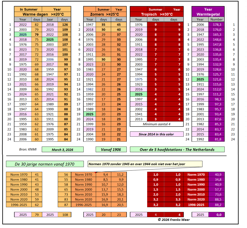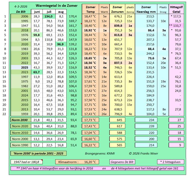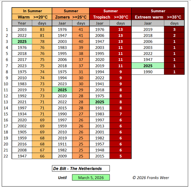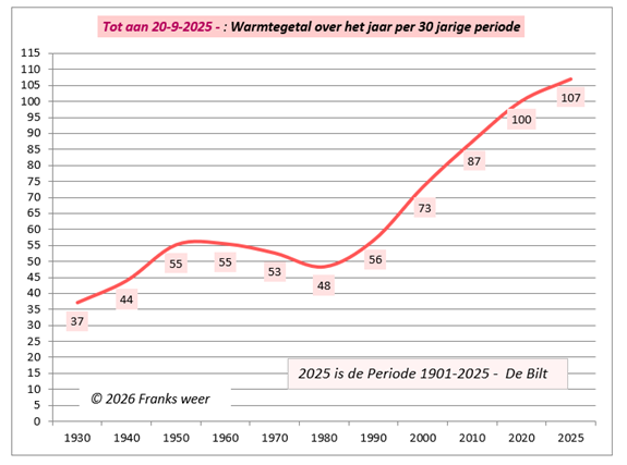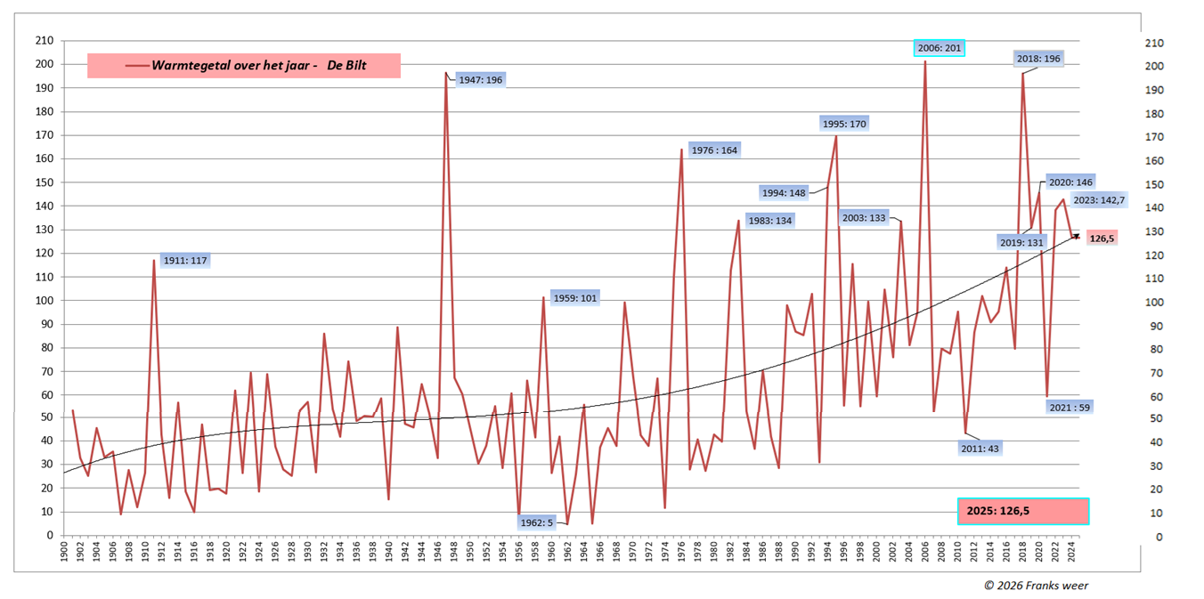 2025: in de lijst, na 22 september stond De Bilt op 112 warme- en 35 zomerse dagen met warmtegetal tot 20 september 126.5 over het jaar.