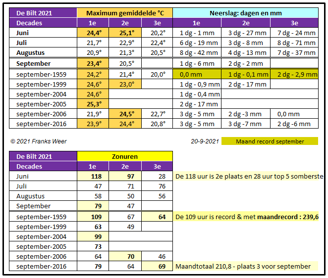 Opvallend was dat de 1e decade van september warmer was dan enkele decades van de zomer (warmer de 3e van juni en alle drie van augustus). Kijkend naar de gemiddelde maxima per decade eindigde de 1e decade van september op plaats 3. Hieronder een overzicht van de hoogste gemiddelde maxima per decade van 2021, waarbij de bijzondere septembermaanden van 1959, 2006 en 2016 meegenomen zijn in het overzicht. De 2e decade was ook droog met 8 dagen warme dagen en in de 3e decade toch nog 5 warme dagen al viel er op 29 september wel 15 mm regen.