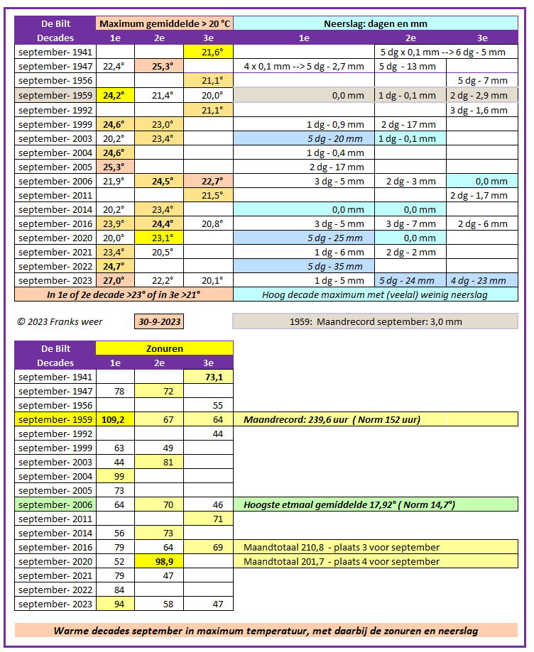 September 2023: zacht en zonnig,  met zeer fraaie – en record warme start met op veel plaatsen een hittegolf / veel dagrecords