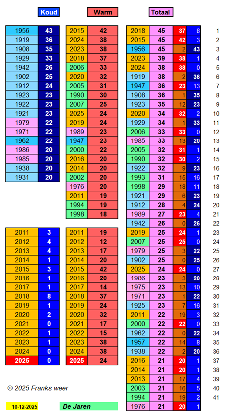 Koudegetal: 4.3 (anno 2024 plaats 6 – minimum getal), de norm van ‘2010 om 2020’ is 59 om 44 (record uit 1942: 332.4 en in 2020 was deze 0.0)