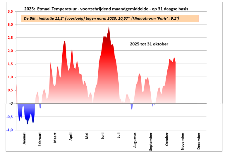 Voorlopige indicatie over de eerste decade van november 2025: het voorlopig geschat etmaal gemiddelde 10,7° en het maximum rond 14,4°.