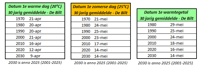 Het aantal zomerse dagen: –. De norm van 1990 was 5,7, die van 2000 was 7,1, die van 2010 is 8,8 en die van 2020 is 9,2.