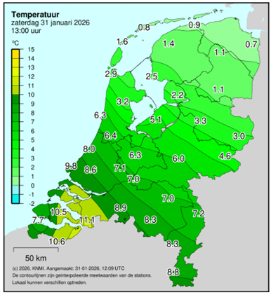 In het midden en zeker in het zuiden is het veel zachter, in het uiterste zuiden is 9° de komende dagen goed mogelijk/ te verwachten.