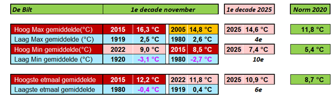 In de eerste decade van november 2015 was de gemiddelde etmaaltemperatuur 12,2 °C in De Bilt (de norm anno 2020 is 8,7°). Het gemiddelde maximum lag toen op 16,3° (in 2025 rond 14,6°).