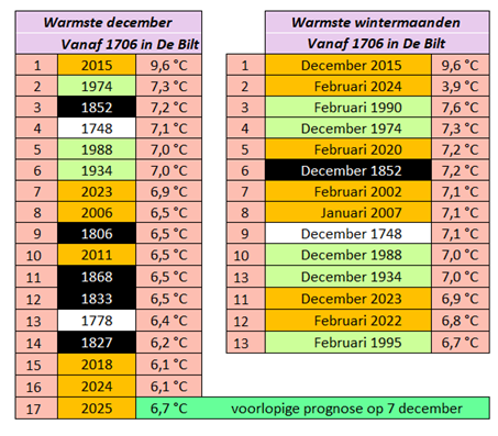 December 2025 lijkt tot de top 8 zachtste te gaan behoren, de kans is groot. Overigens is december 2015 met afstand de warmste decembermaand .