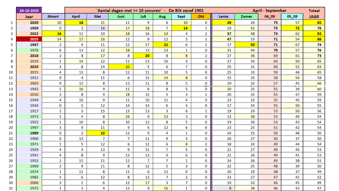 – Tabel aantal dagen met meer dan 10 uur zon, met 2025 (periode april-sept)