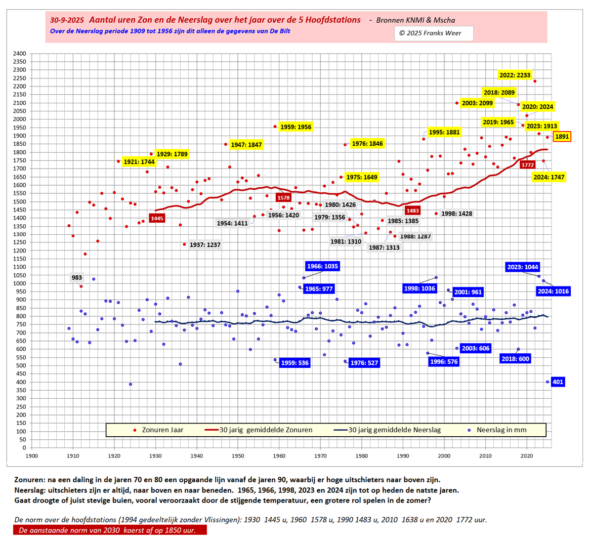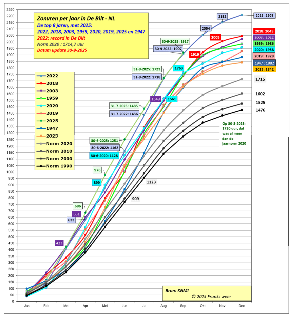 – 2025 actueel – na september:warm (op plaats 8), droog (op plaats 12) en zeer zonnig (al in de top 7 op jaarbasis met 1917 uur)